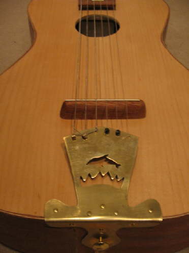 Eine von 8 in Serie gefertigten Gitarren, deren Bauform zwischen 3/4 und Kindergitarre liegen. Die Saitenaufhängung aus Messing zeigt das Emblem von "Shitz & Fritzi", einem Instrumentenbauprojekt in 2001 von R. Kaiser und D. Tümmler.